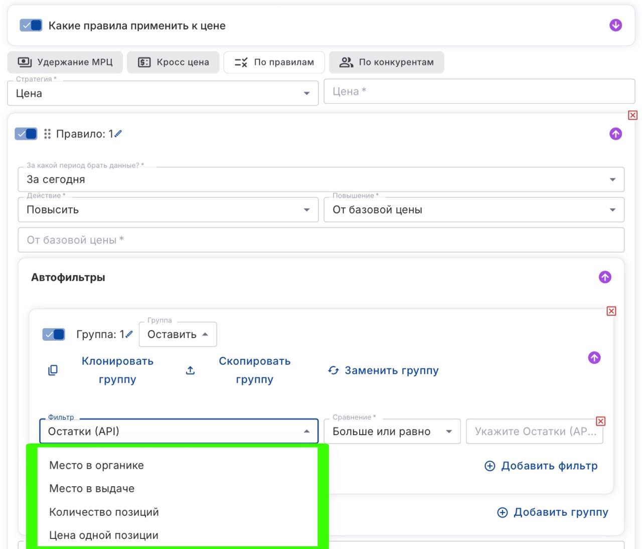 **Новые фильтры: ** 1️⃣ Место в органике Меняйте цену в зависимости от позиции товара в органической (неоплаченной) выдаче. 2️⃣ Место в выдаче Фильтр учитывает общую позицию с учётом рекламы — подходит для динамичных ниш. 3️⃣ Количество позиций Фокусируйтесь только на ключах с нужным уровнем конкуренции — например, применять правило только если конкурентов больше 50. 5️⃣ Цена одной позиции Фильтруйте по стоимости попадания в выдачу — если цена слишком высокая, система может автоматически снизить стоимость товара.
