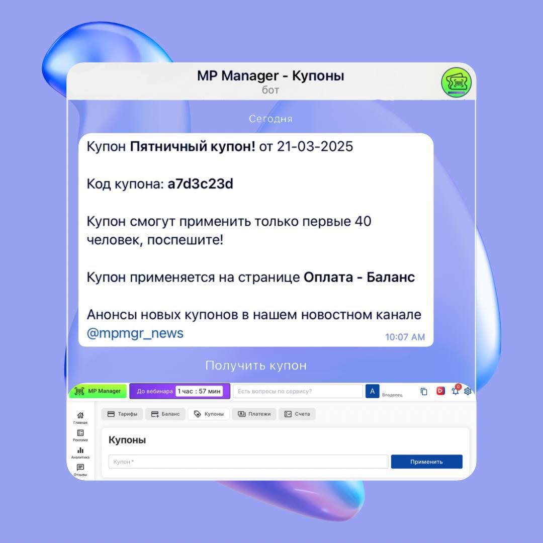 При применении купона на ваш баланс в MP Manager добавится 250₽ 🎁 Применить купон успеют только первые **40 человек **