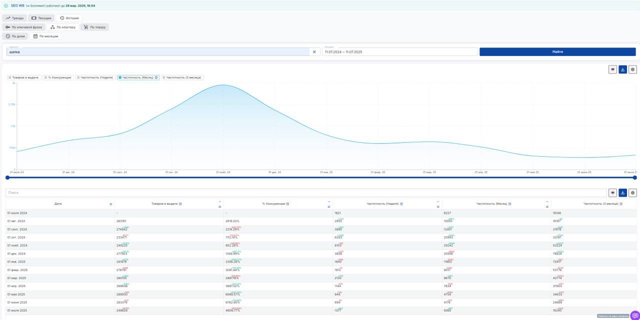 ✔️ В нашем сервисе частотность всегда считалась по кластерам, а не по отдельным ключам — изменения WB не повлияют на точность анализа. ✔️ Вся историческая информация, включая запросы по артикулу, сохраняется и остаётся доступной. ✔️ Дополнительно можно посмотреть отчёты по вводу конкретных поисковых фраз и артикулов.