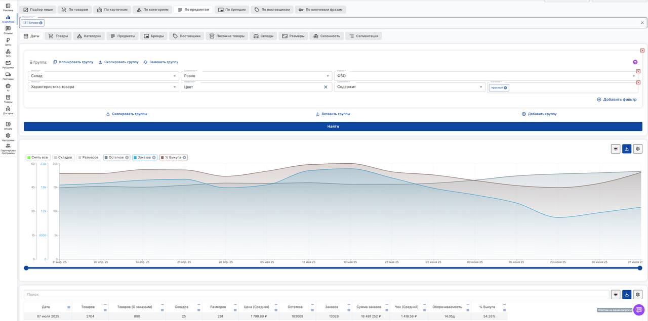 💡 Можно комбинировать фильтры: — по ФБО/ФБС — по складам, категориям, брендам — по остаткам, % выкупа, цене — по любой характеристике товара (хоть «длина рукава»)