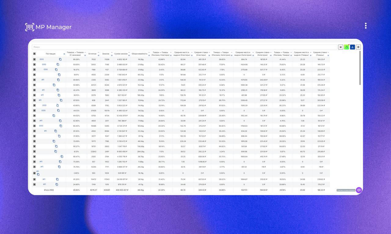 — увидеть, сколько у поставщика товаров с заказами и какова их оборачиваемость — посмотреть, какой процент товаров участвует в рекламе (поиск / каталог / карточка) — сравнить средние ставки по каждому блоку (кластер, категория, полки) — сразу увидеть среднюю позицию в выдаче — отдельно по поиску, отдельно по каталогу — проанализировать, у кого высокие продажи и какие рекламные стратегии они используют