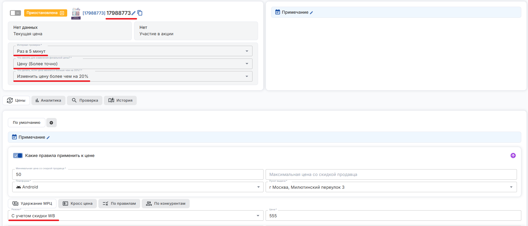 Обращайте внимание на эту настройку при настройке стратегии управления ценами. Если по вашим условиям сервис должен изменить цену более чем на 20%, но вы выбрали "не изменять цену" в пункте 5, то сервис не применит нужную цену