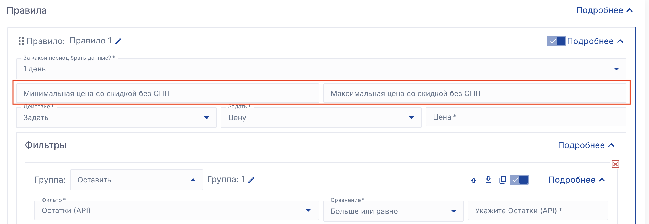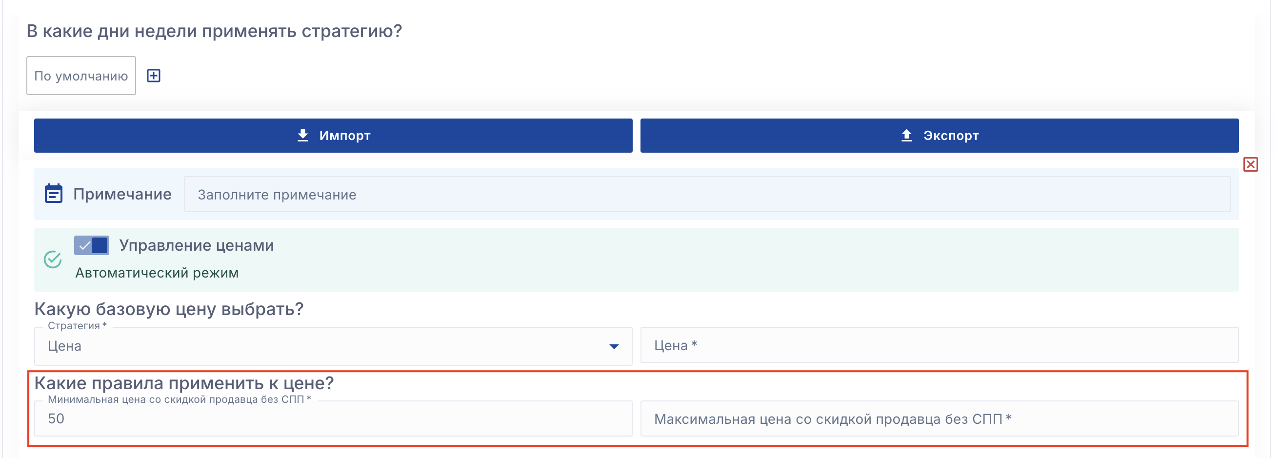 Общие границы минимальной и максимальной цены для всех правил. При необходимости у каждого правила можно задать свою минимальную и максимальную цену