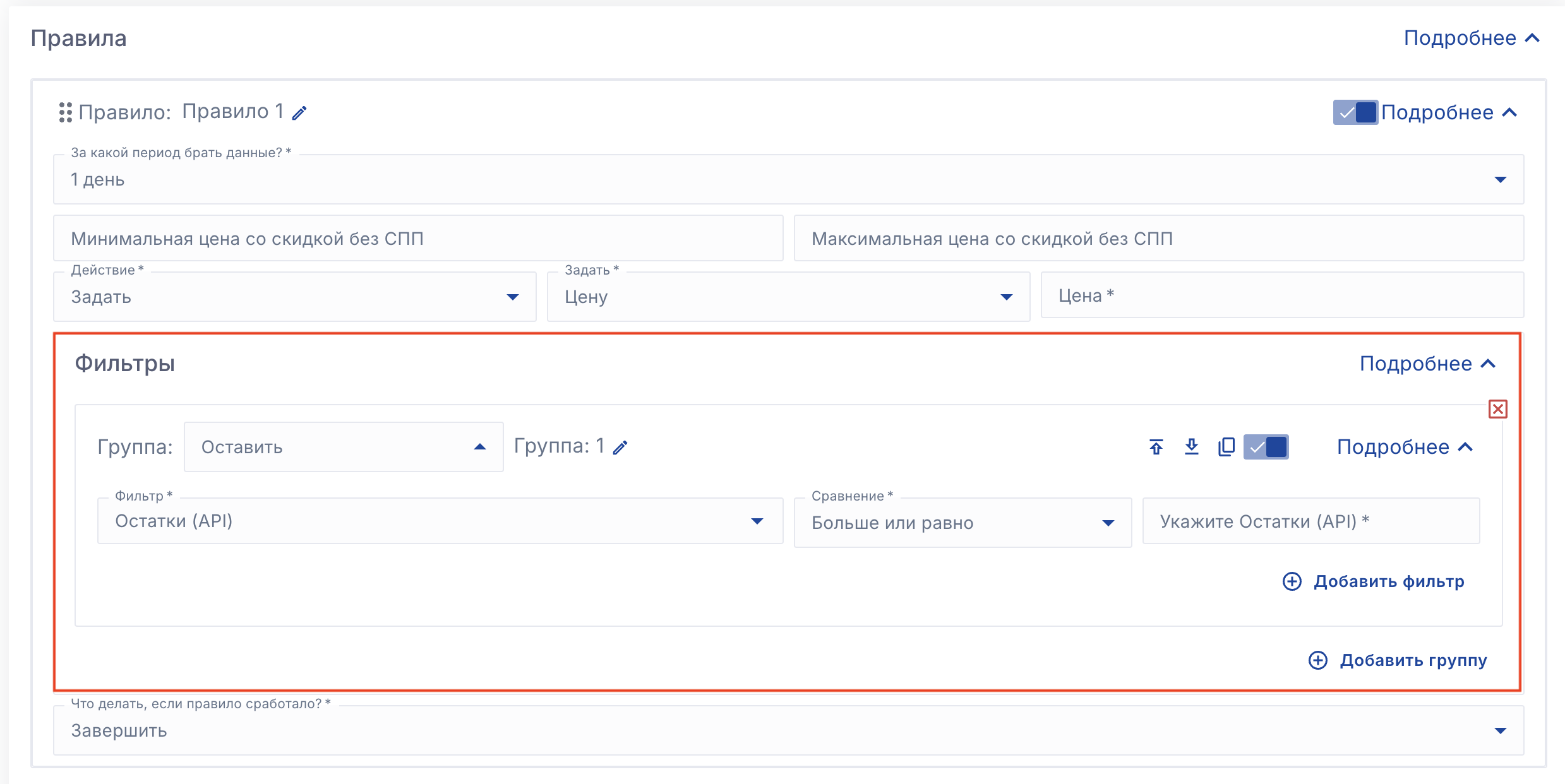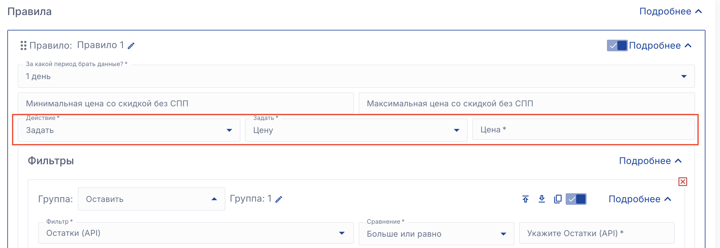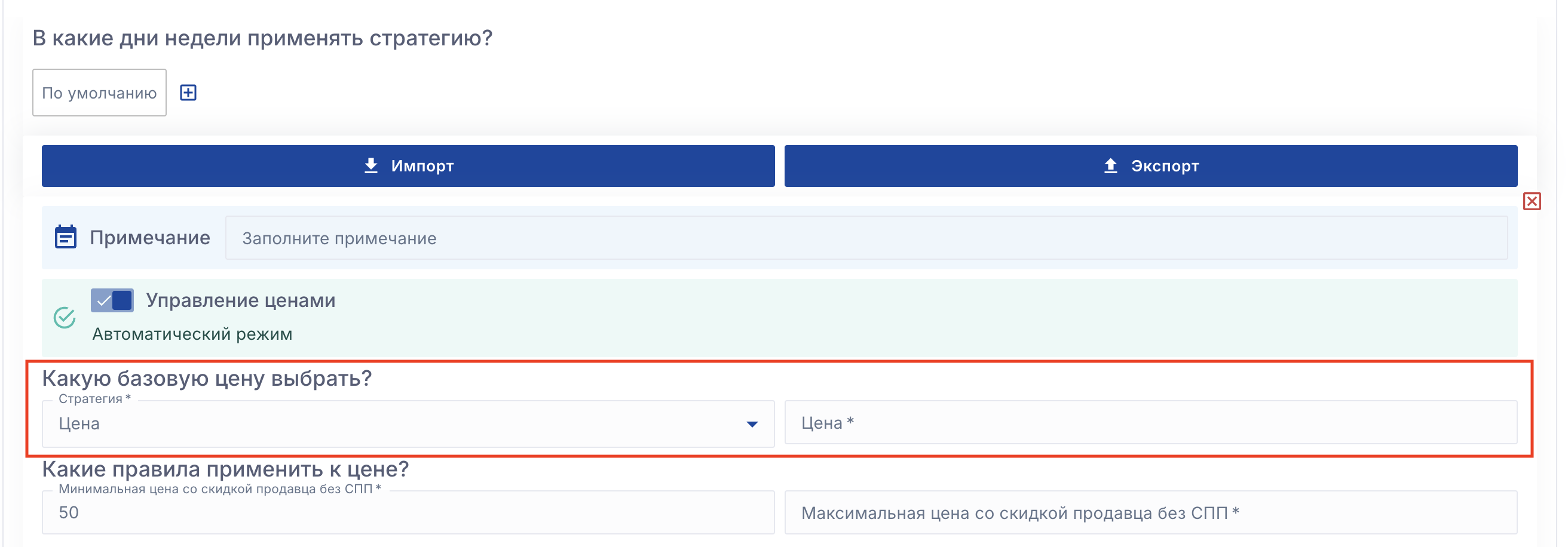 Обращайте внимание на эту настройку при настройке стратегии управления ценами. Если по вашим условиям сервис должен изменить цену более чем на 20%, но вы выбрали "не изменять цену" в пункте 5, то сервис не применит нужную цену