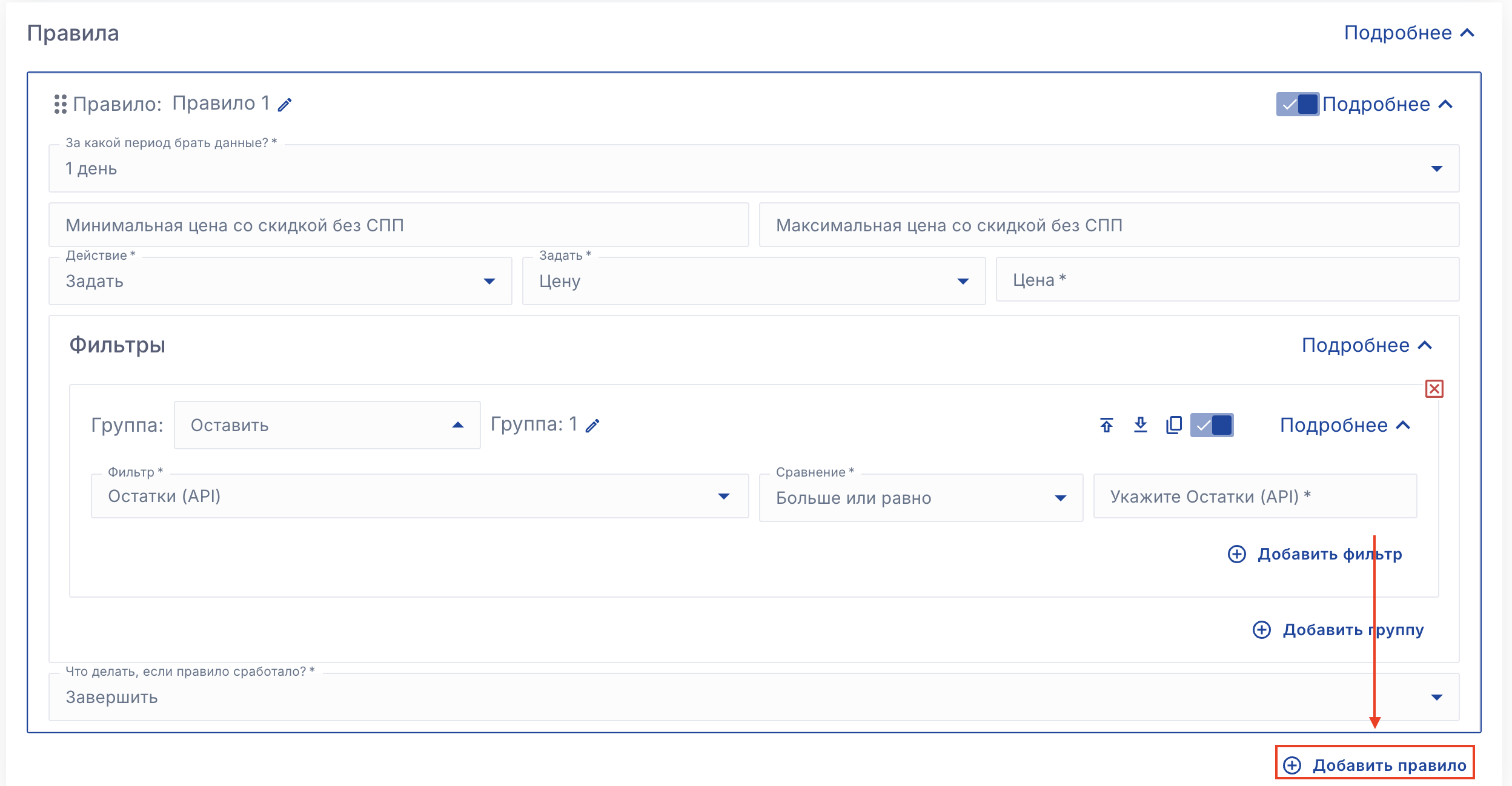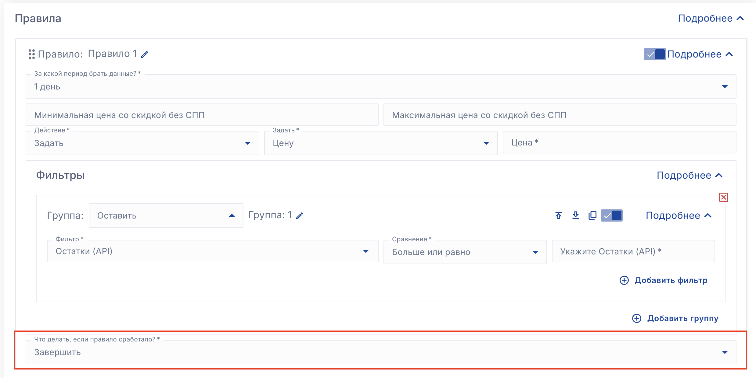 Завершить - Завершить расчёт цен после срабатывали первого подошедшего правила и не применять следующие подходящие правила