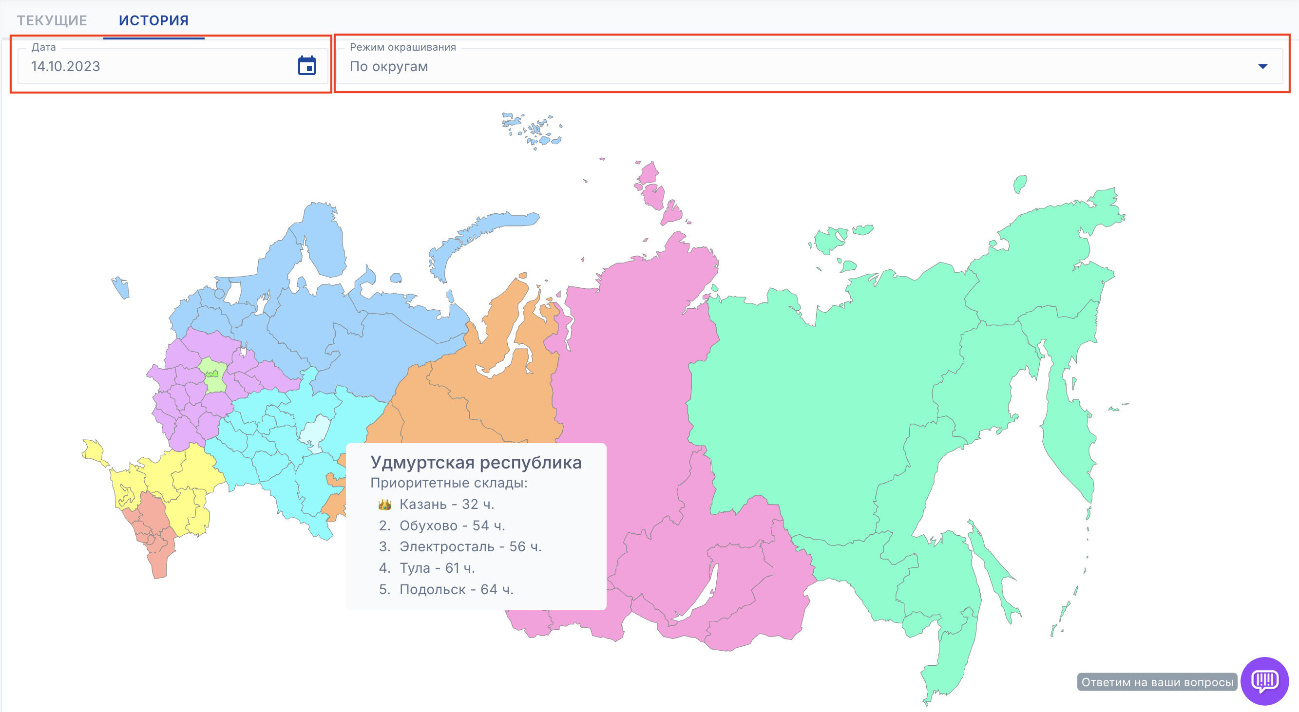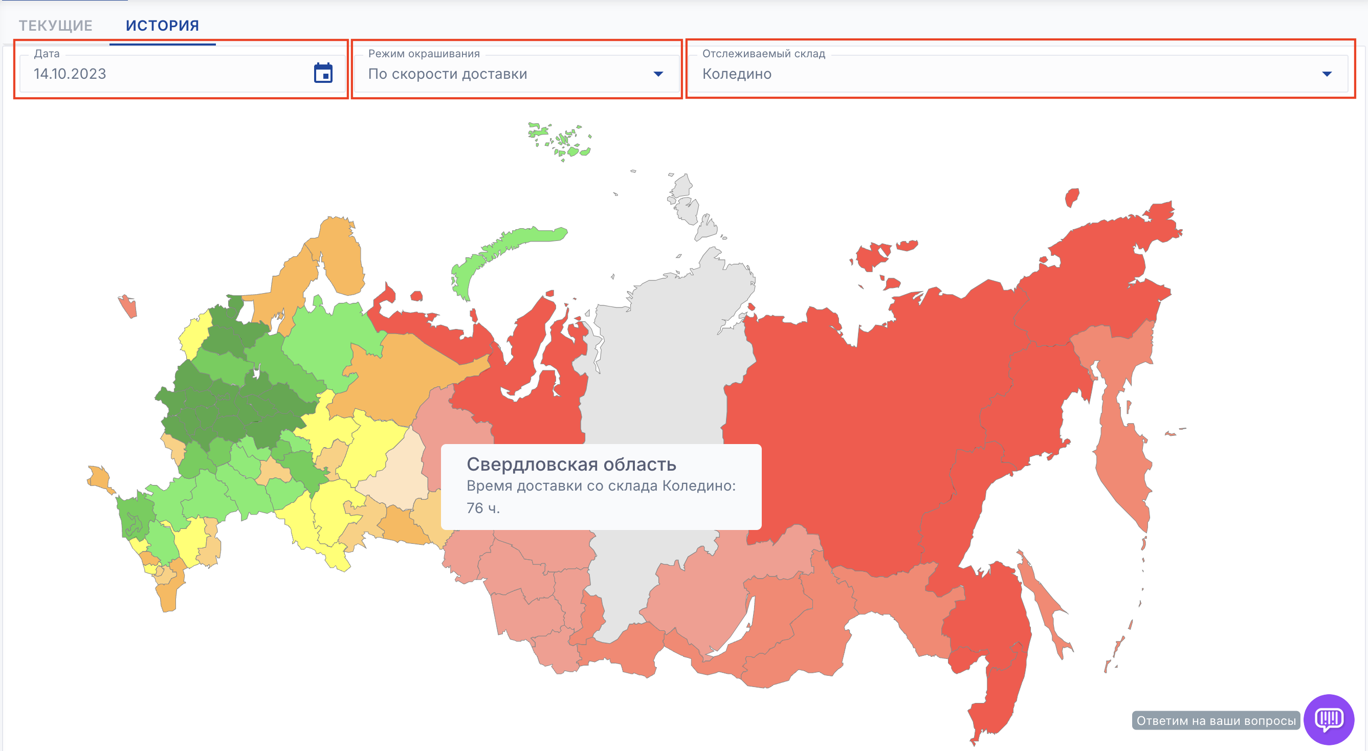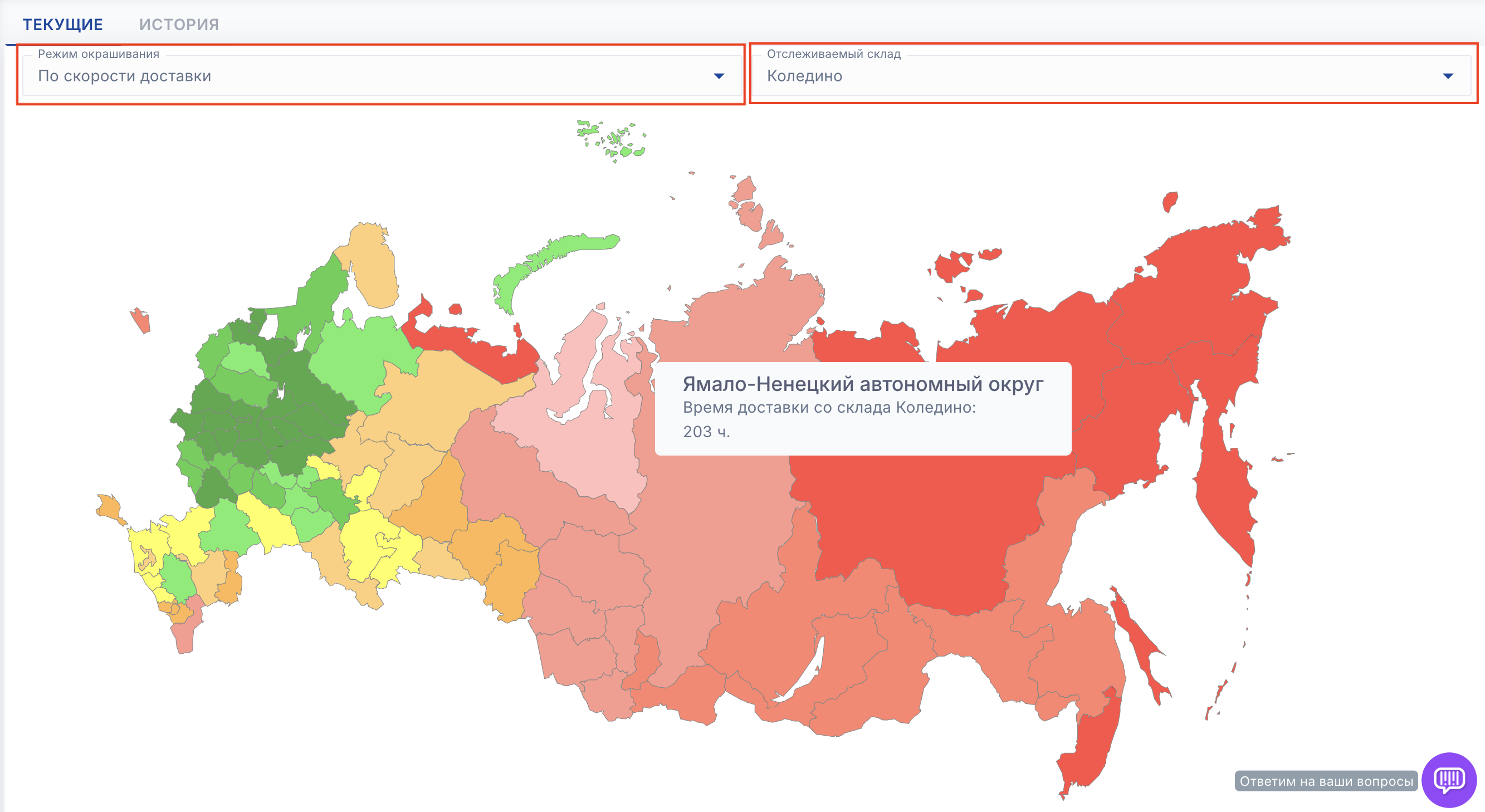 - По скорости доставки - показывает цветом в какие регионы доставка будет быстрее с выбранного склада. Самая быстрая доставка - зеленый цвет, самая медленная - красный цвет
