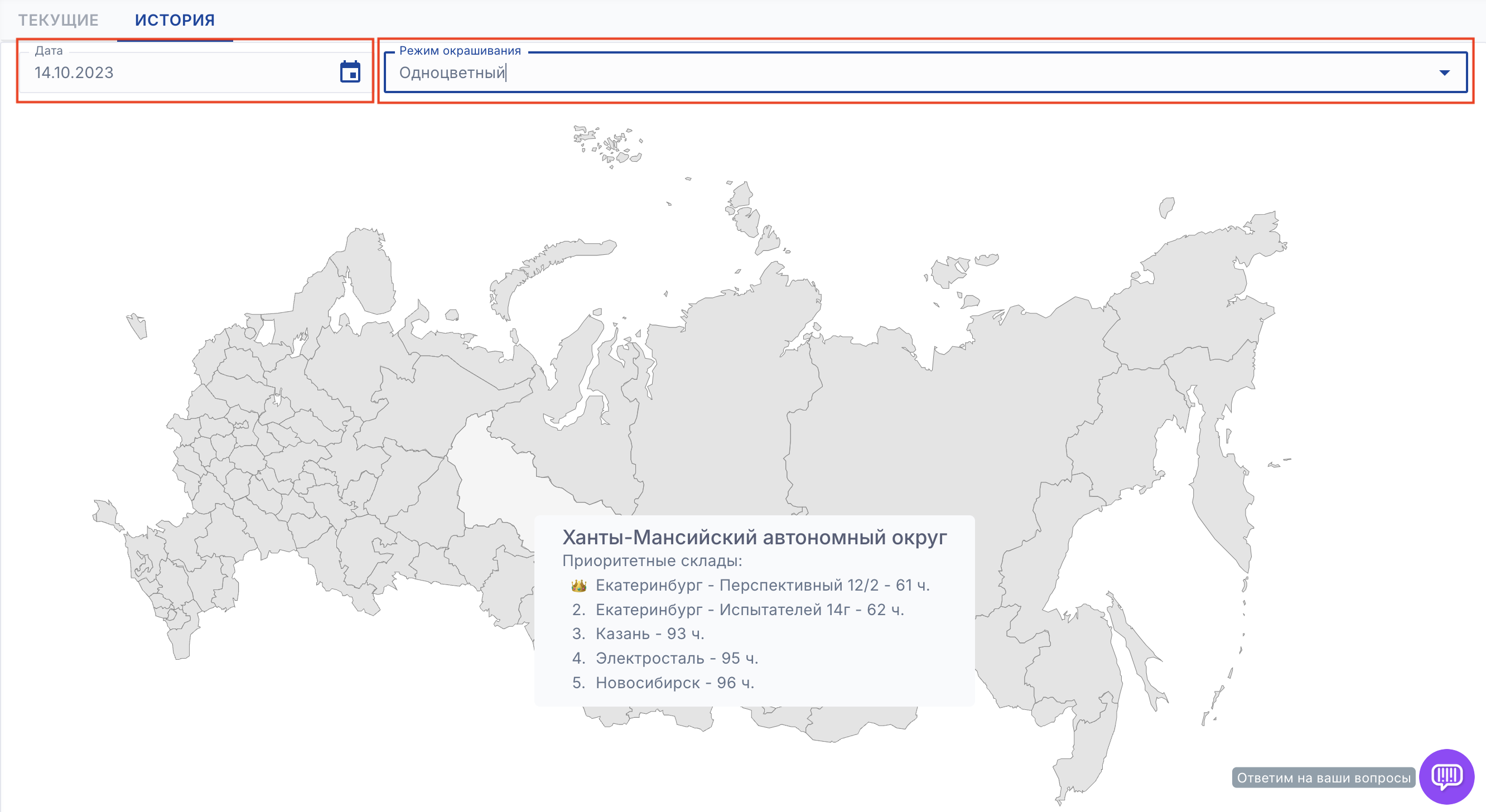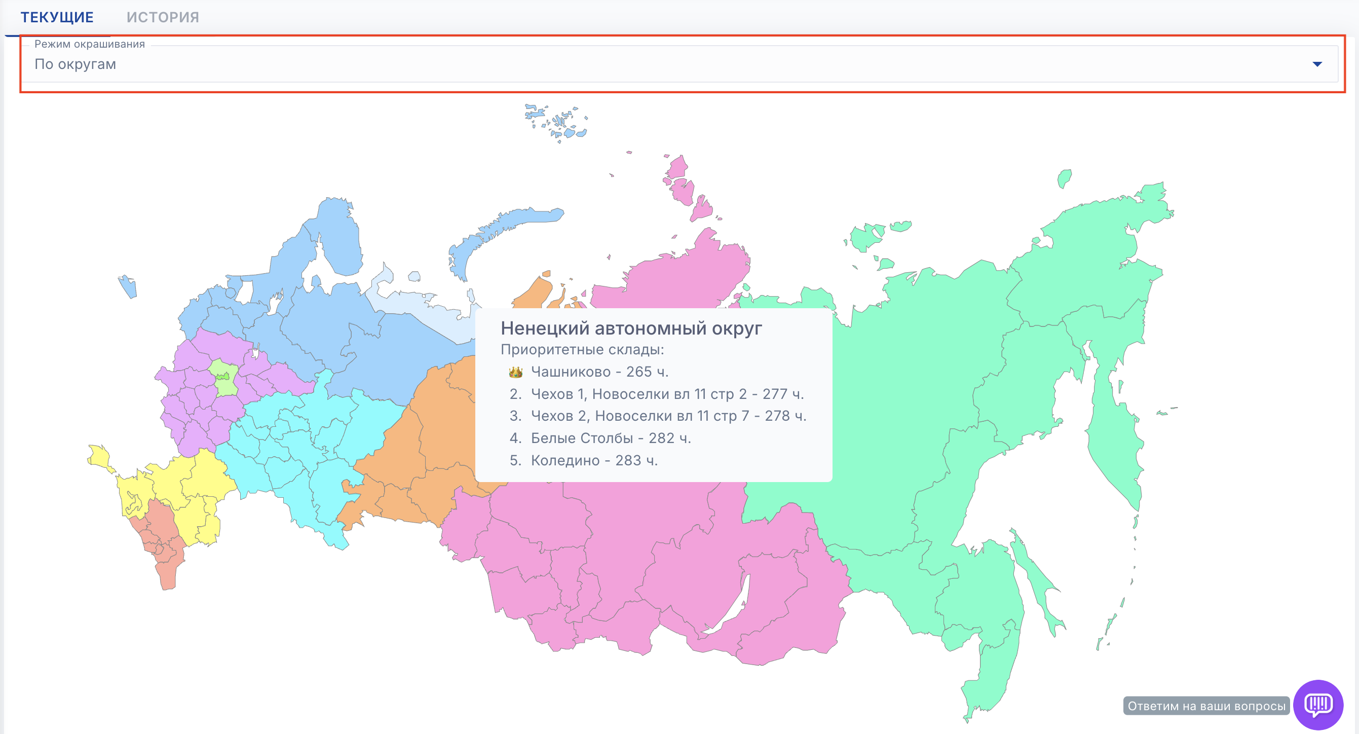- По регионам - показывает приоритетные склады для регионов (склады с самой быстрой доставкой)
