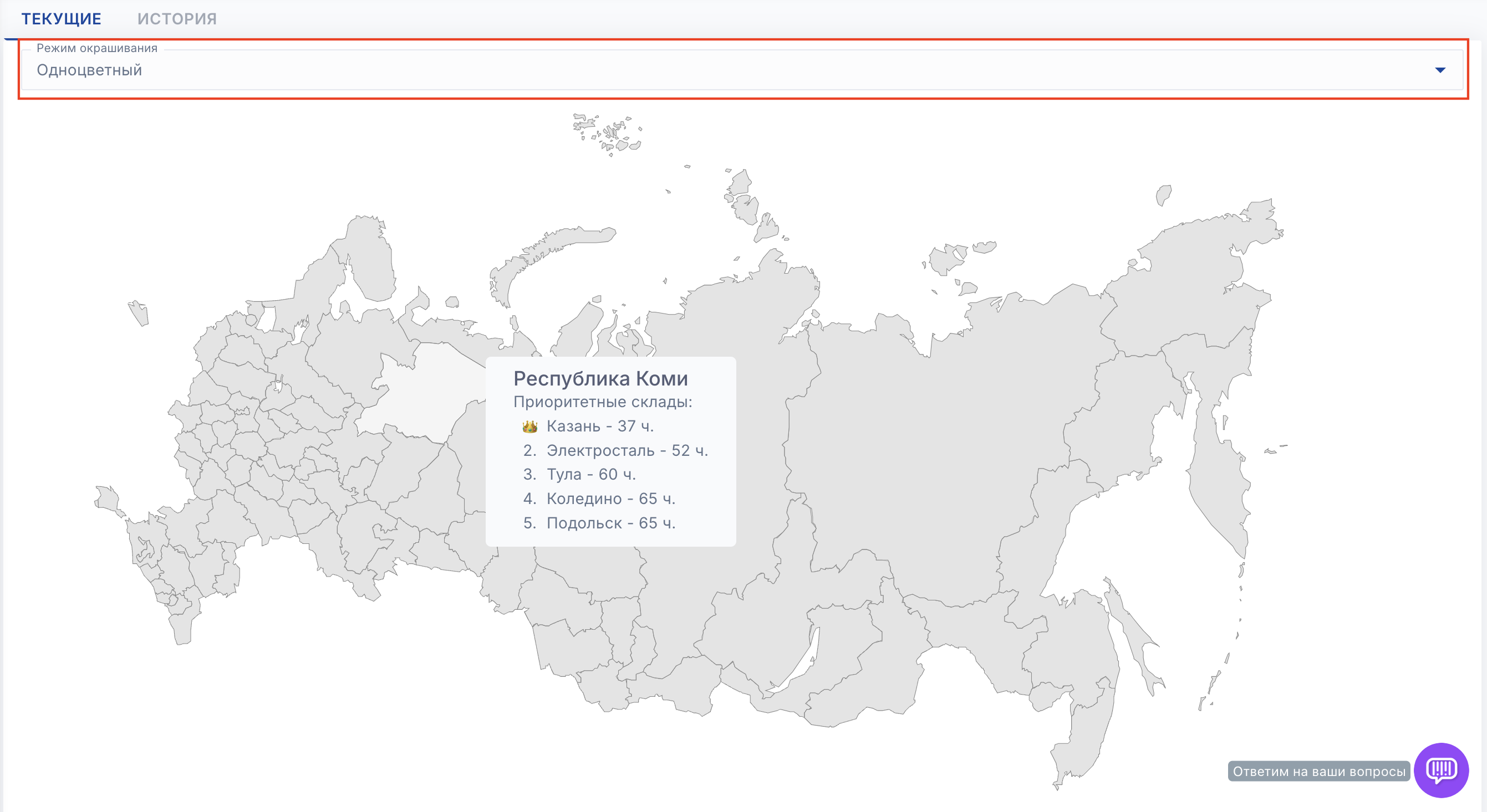 Наведите на регион, чтобы увидеть список приоритетных складов (складов с самой быстрой доставкой)